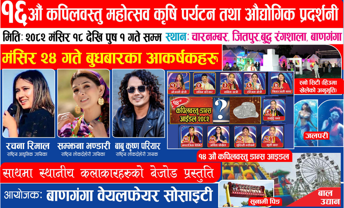 बुद्ध रंगशालाको कृषि, उद्योग, पर्यटन तथा खेलकुदमा लगानी युवाको हातमा सुनौलो विहानी भन्ने मूल नाराका साथ मंसिर १८ गतेदेखि बाणगंगा स्थित बुद्ध रंगशालामा बाणगंगा वेयलफेयर सोसाइटीको आयोजनामा सुरु भएको १६औं कपिलवस्तु महोत्सव, कृषि पर्यटन तथा औद्योगिक प्रदर्शनीले कपिलवस्तुलाई उत्साहित बनाउँदै लगेको छ । सिचो मौसमा २३ गते मंगलबार राष्ट्रिय चर्चित गायिका बबिना किराती, थारु गायक राज कुस्मी, चर्चित प्रतिक्षा एण्ड व्यान्डको बेजोड प्रस्तुतिका साथै १४औं कपिलवस्तु डान्स आइडलको प्रस्तुतिसँगै स्थानीय कलाकारहरुको बेजोड प्रस्तुति दिएका थिए । राष्ट्रिय गायिका किराती, थारु गायक कुस्मीका लोकप्रिय गीतहरू गाउँदा र प्रतिक्षा एन्ड व्यान्डको बेजोड प्रस्तुतिमा दर्शकहरू झुमेसँगै बुद्धरंगशाला चिसो मौसममा तातिएको थियो ।